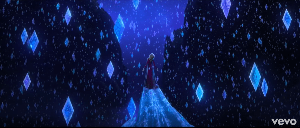 艾莎一邊追尋著未知的聲音,一邊唱歌回應,穿過了城堡迴廊,走經了城外湖泊,艾莎在途中遇到了化成發光亮點的魔法森林及原住民,還有守護著森林的風、火、土以及水四大元素,最終艾莎來到了海邊的懸崖,她踏上崖上的最高點,在歌曲的高潮中,使出她的冰雪魔法,將空氣中的水氣凝結成了象徵著第五大元素的冰晶。